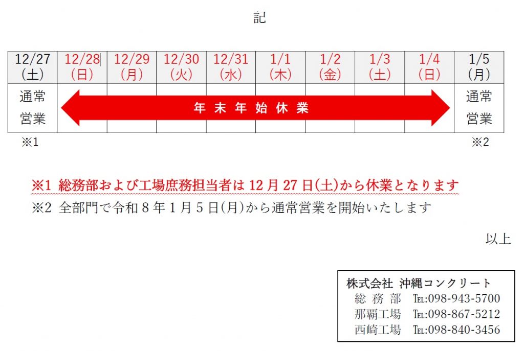 年末年始休業日のお知らせ 投稿日: 2025年12月12日 投稿者: %s oc_admin 令和7年12月12日 関係各位 株式会社 沖縄コンクリート 年末年始休業日のお知らせ 平素より格別のご高配を賜り、厚くお礼申し上げます。 さて、誠に勝手ながら、弊社では年末年始(令和7年~令和8年)の期間、下記のとおり休業することといたしました。 皆様にはご不便とご迷惑をおかけいたしますが、何卒、ご容赦くださいますようお願い申し上げます。 よい新年を迎えられますよう、皆様のご多幸を心よりお祈り申し上げます。